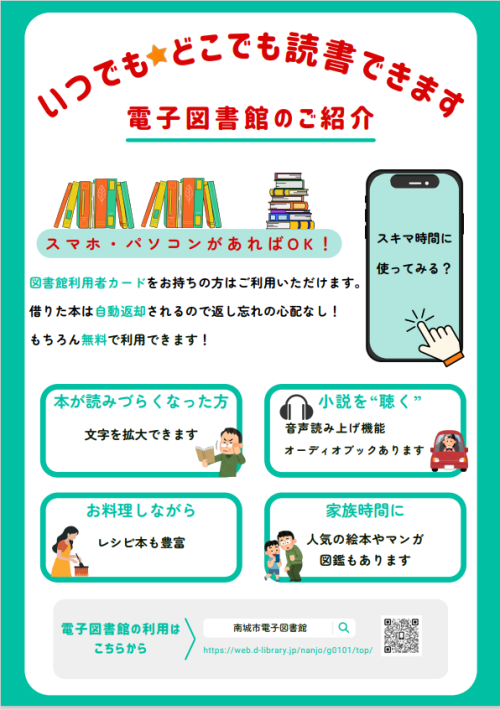 南城市立図書館の利用カードをお持ちの方(市内在住・お勤めの方・在学の方)は電子図書館をご利用いただけます。
