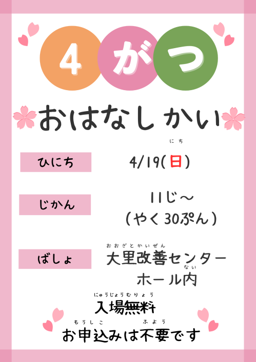 【大里】4/19(日)おはなしかい開催