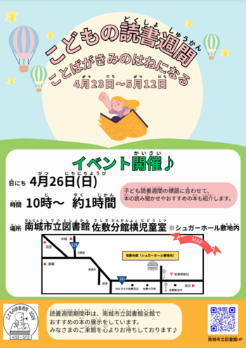 南城市立図書館ではこどもの読書週間期間中、読み聞かせイベントの実施や各図書館にておすすめの本を展示しております。